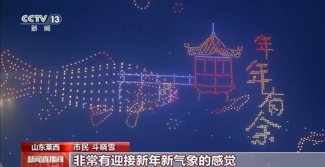在山东莱西市,1500架无人机以深邃的夜空为幕布,精准编队、灵动变幻,依次呈现出“元旦快乐”“龙腾盛世”“凤舞神州”“骏马奔腾”等字样和图案,市民游客纷纷用手机记录下这美好图景。