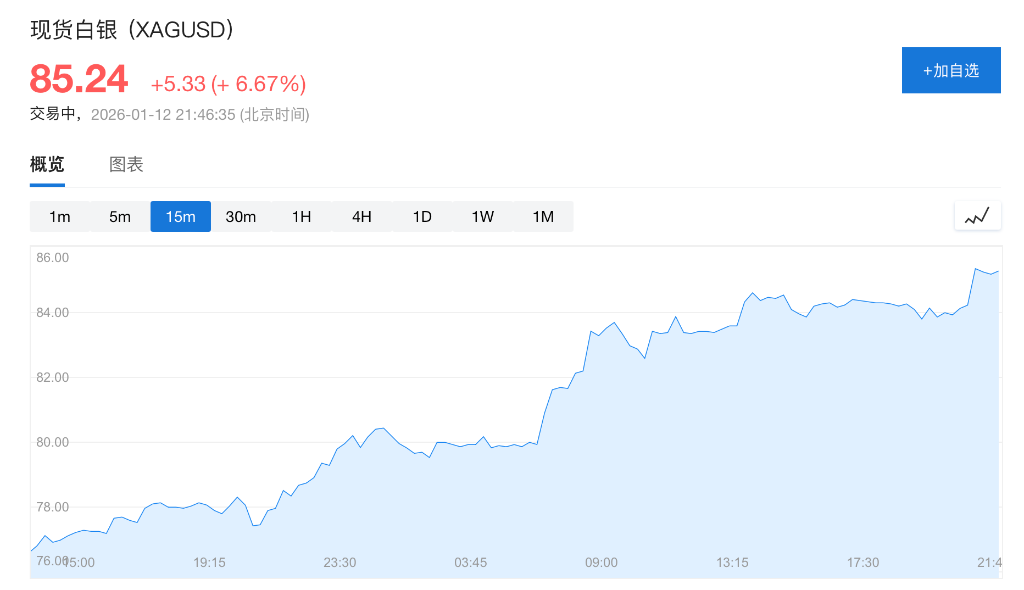 贵金属价格大幅飙升,屡创新高。现货黄金站上4620美元/盎司,日内涨幅达2.44%,开年以来累涨逾300美元;现货白银大涨7%至85.24美元的历史新高。