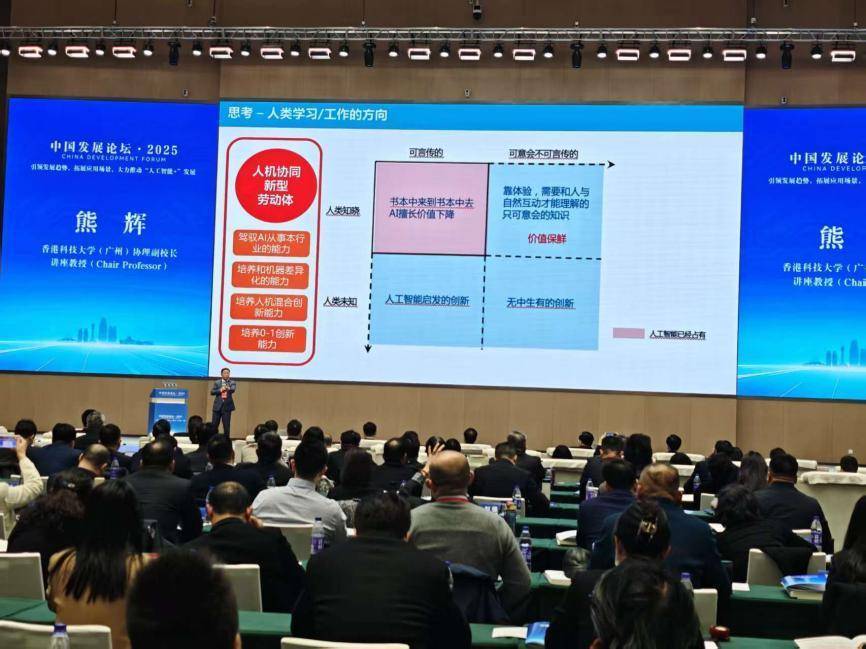 香港科技大学(广州)协理副校长、讲座教授熊辉从人才与生产力变革角度,描绘了人工智能时代的新型劳动图景。他认为,随着开源大模型普及,“人工智能军备竞赛”正从“贵族战争”转向“平民化竞争”,中小企业用百万元级算力即可开发垂类智能应用,极大降低了创新门槛。