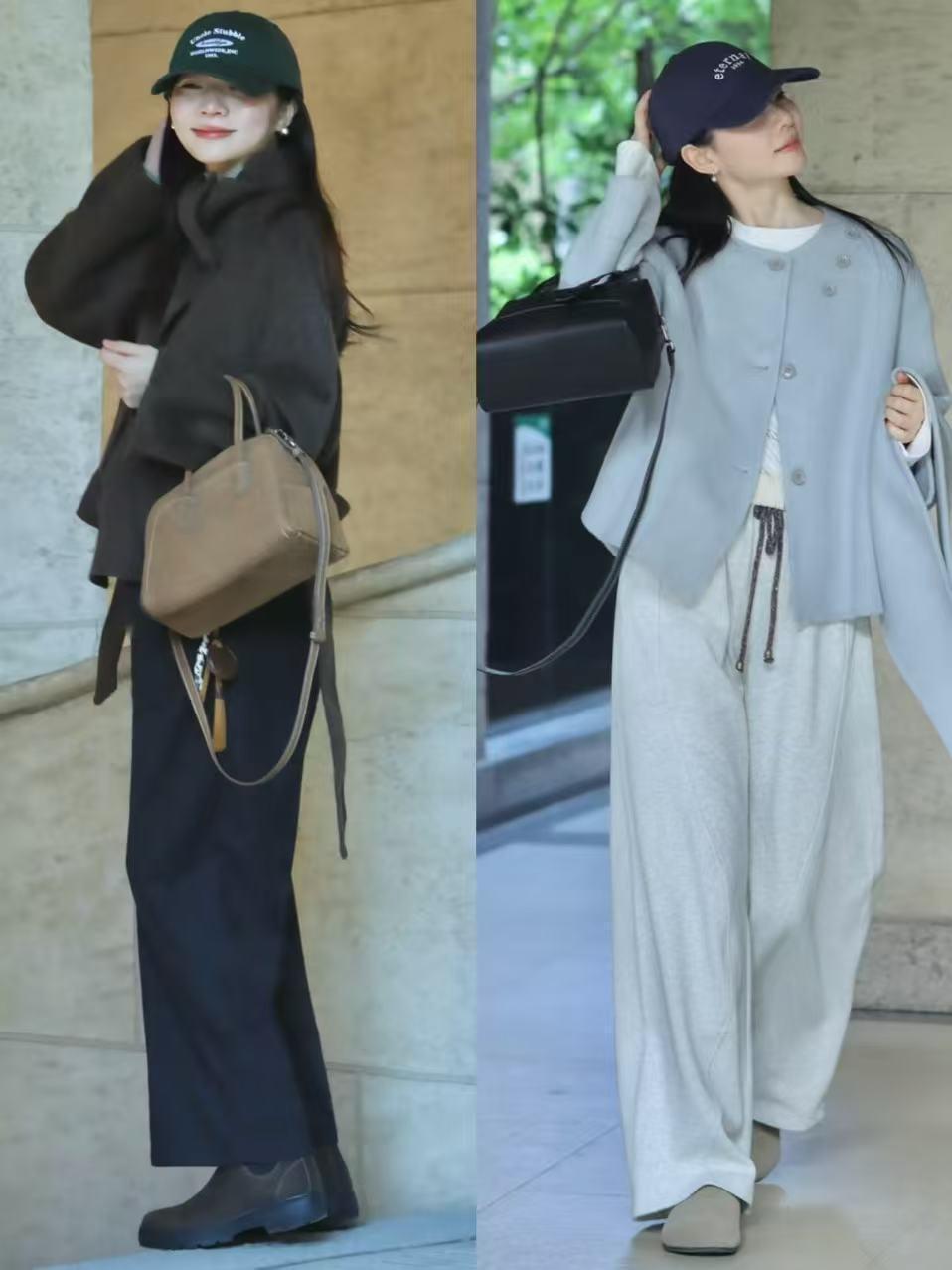 当你选择阔腿裤来搭配大衣外套的时候,裤脚尽量不要太长,到脚踝的位置就可以了,因为过长的话显得拖沓邋遢,上面这条白色阔腿裤和灰色阔腿裤长度正好合适,搭配驼色的短外套,加上卡其色的棒球帽,使得穿搭者年轻十岁都不止。