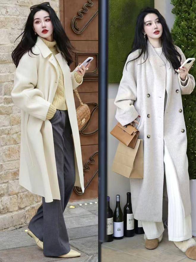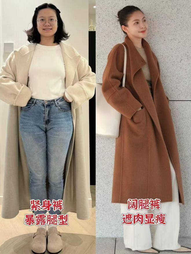 第一章节:穿阔腿裤更容易遮肉显瘦,搭配大衣更显高级tips①长款大衣搭配白色阔腿裤
