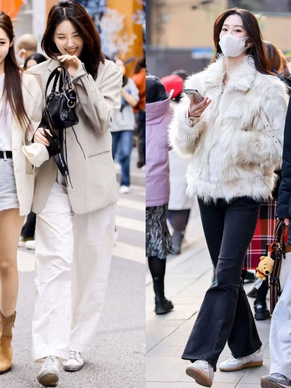 如果想要穿的低调一点,直接选择一条灰色的,牛仔裤来搭配上白色的皮草外套,脚穿那双白色的德训鞋,这样的穿搭很适合普通大众女性借鉴,不过这条牛仔裤大腿的位置稍微收紧了一点,但小腿的位置正好能修饰腿型。