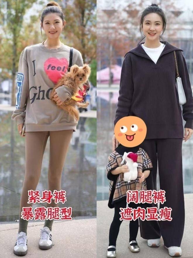正常情况下来说还是选择一条阔腿裤来穿搭,例如上图右边这1套穿搭,用的是深咖色的卫衣,内搭保暖打底衫,加上一条同色系的阔腿裤,脚穿一双运动鞋,遮肉显瘦。