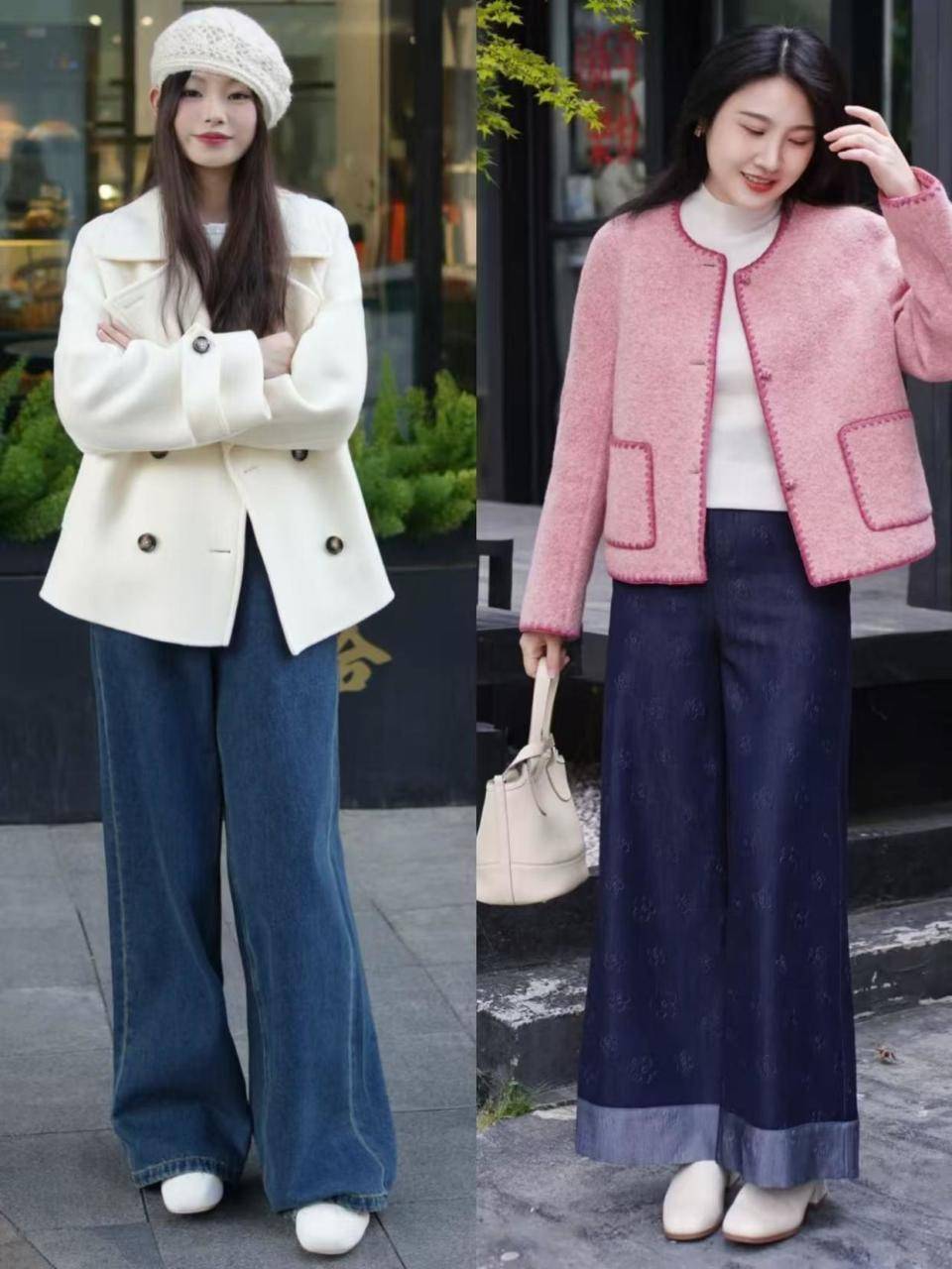 第三章节:短大衣搭配阔腿裤,显高显瘦tips①白色短大衣搭配蓝色牛仔阔腿裤