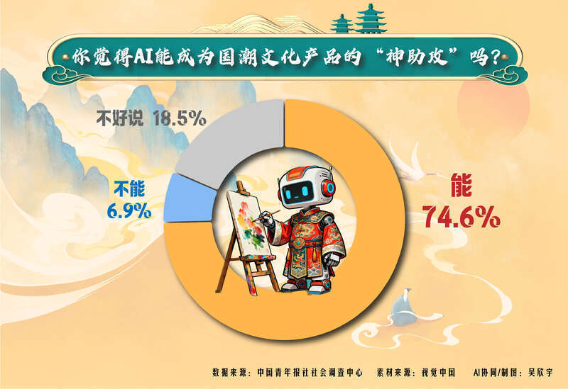 生成一款新颖的新中式纹样、根据歌词谱一段古风旋律……近日,中国青年报社社会调查中心联合问卷网(wenjuan.com)发布的一项有2002名青年参与的调查显示,74.6%的受访青年认为AI能成为国潮文化产品的“神助攻”。