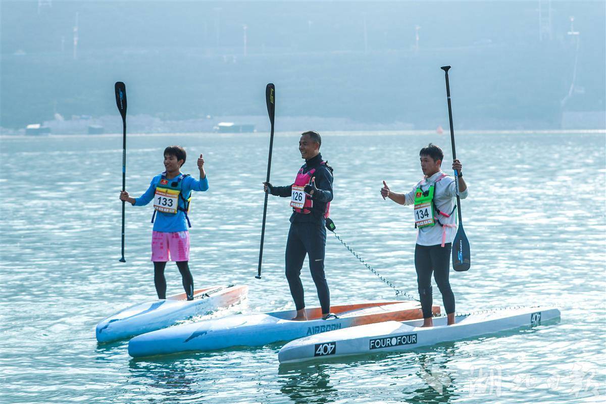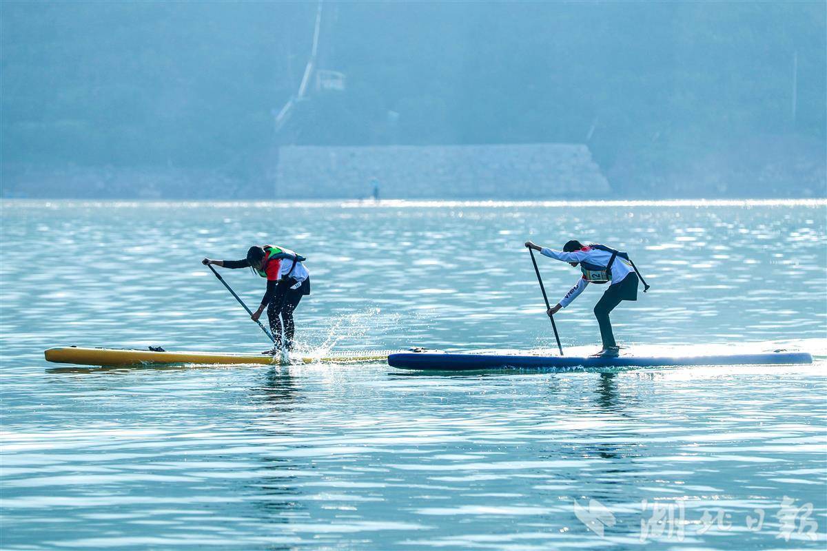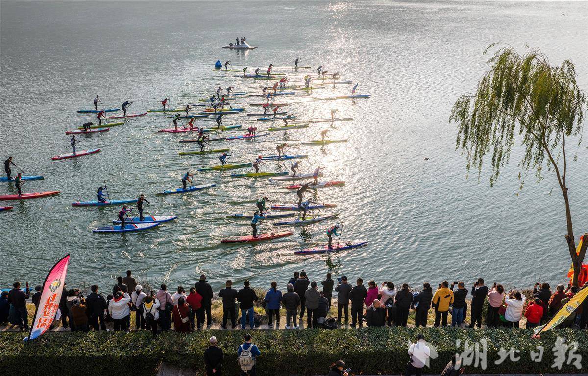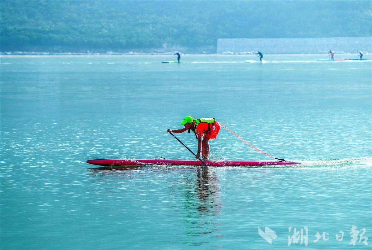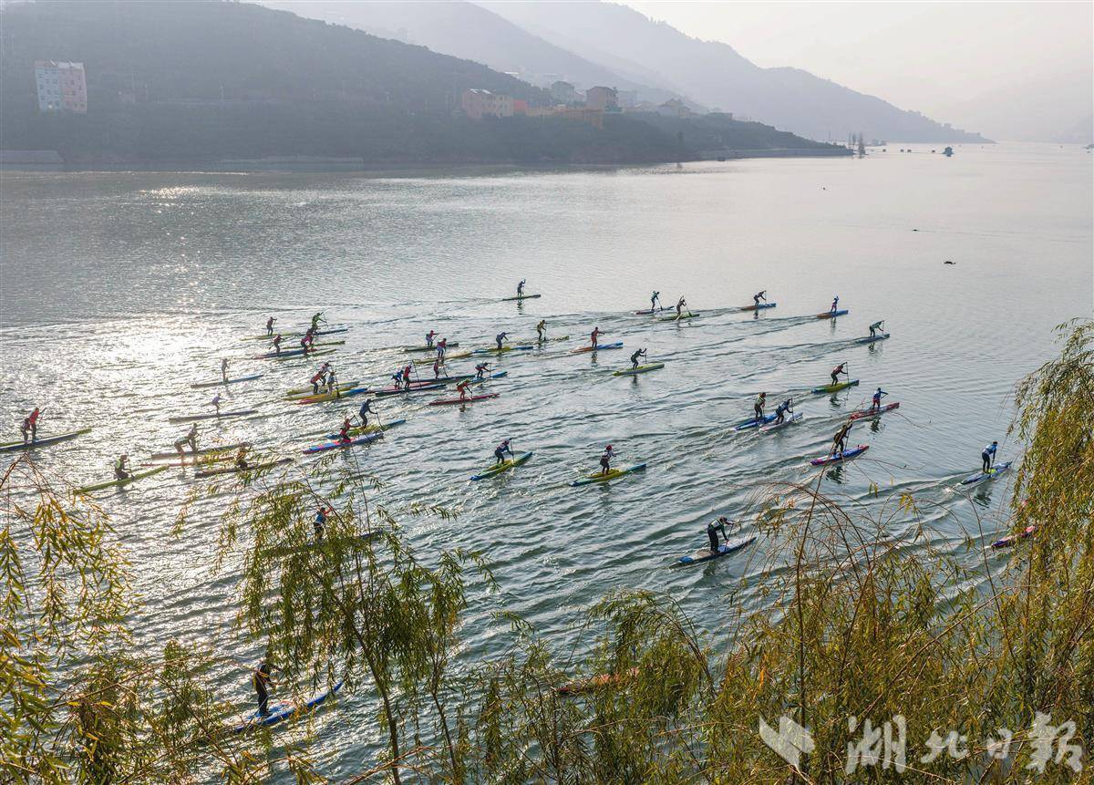 12月6日,桨板参赛选手在秭归县水田坝乡三峡橙谷·吒溪河景区水域挥浆争先。当日,秭归县桨板公开赛在水田坝乡三峡橙谷·吒溪河景区举行,来自全省各地市的10余支代表队、105名选手参赛。此次比赛是秭归县推动“体育+旅游+产业”融合发展的一次生动实践,借助三峡库区优美的自然水域环境,不仅促进了当地水上运动的发展,也吸引了游客观赛,进一步提升了区域的知名度。(视界网 王罡 韦雪梅 摄)