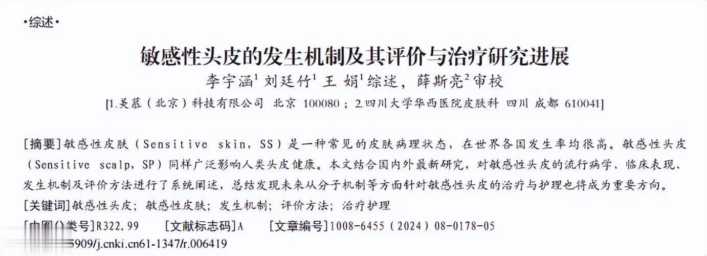 参考文献[1]李宇涵.敏感性头皮的发生机制及其评价与治疗研究进展,中国美容医学,2024-08-10