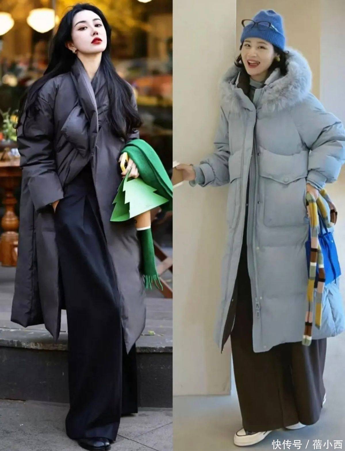若想跳出单调,可尝试深浅结合的思路,深色长款羽绒服搭配浅色阔腿裤和彩色内搭。