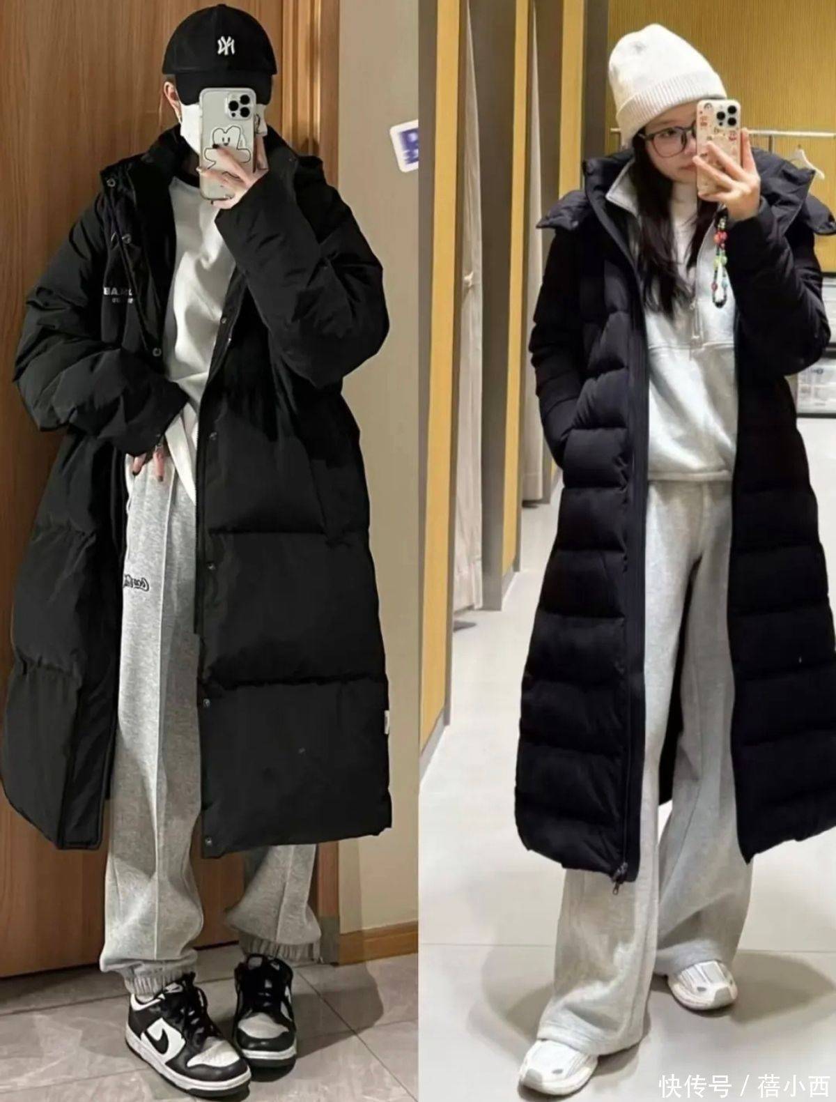 高级感的核心往往藏在简约里,“长羽绒服+阔腿裤”的搭配,无需复杂撞色,靠色彩统一就能轻松提升质感,还能悄悄强化视觉延伸感,比如下面这种经典的灰色套装搭配黑色羽绒服,没有彩色点缀,却依旧特别高级。