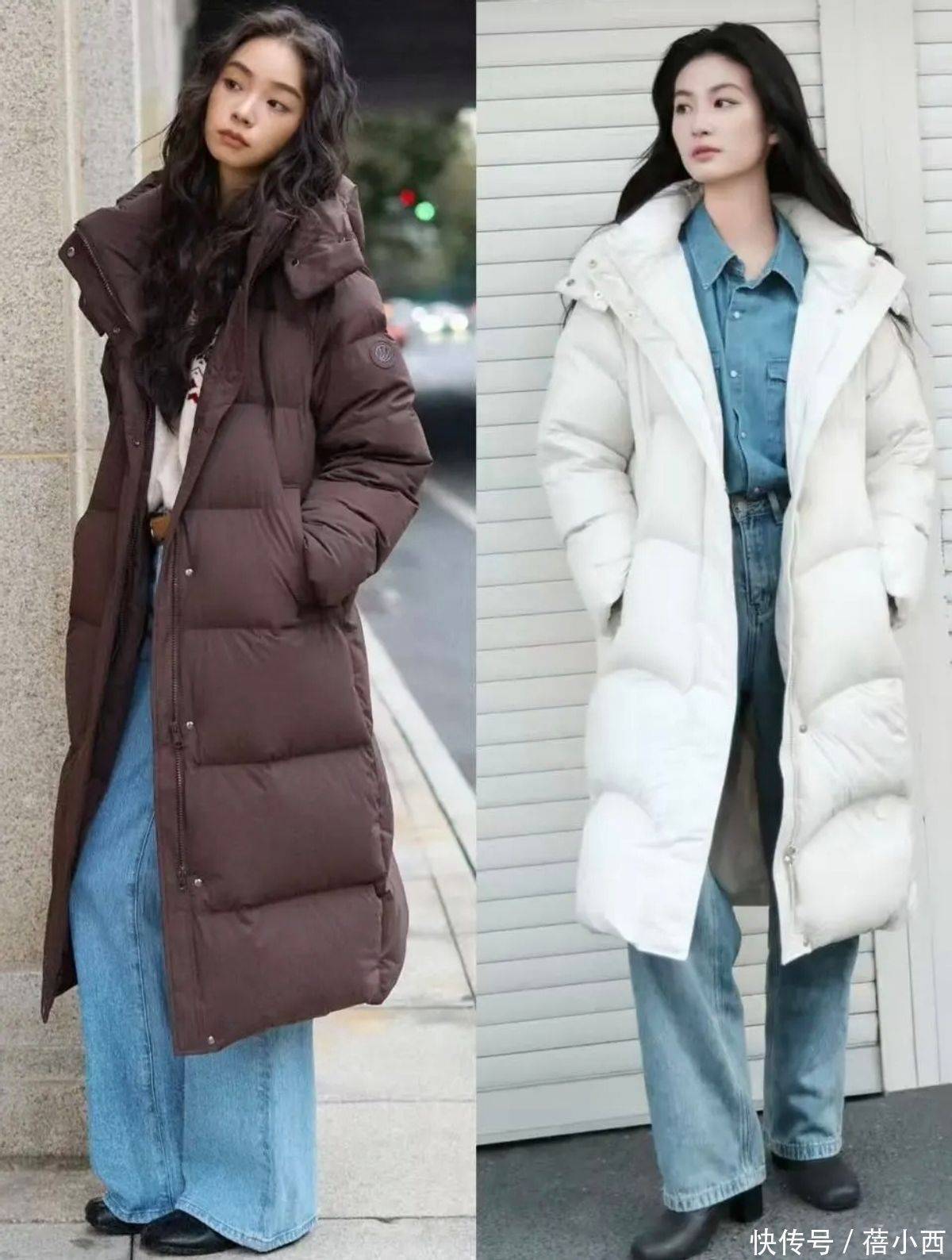 长羽绒服的蓬松感与阔腿裤的宽松感叠加,稍不注意就会穿成“移动棉花糖”,而“松紧对比”的廓形平衡术,能精准中和两者的膨胀感,让造型利落又显瘦,比如廓形长羽绒服搭配修身的打底衫,敞开穿羽绒服,立马就可以收缩围度,显瘦一圈。